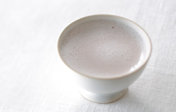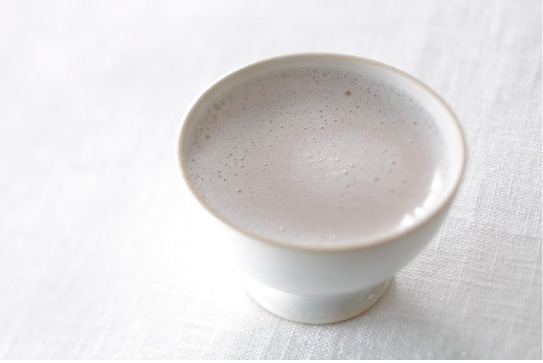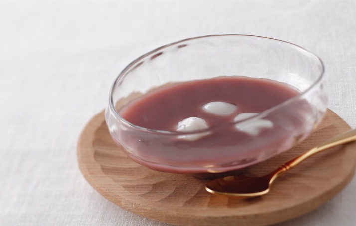 生成りのこしあんは薄紫の柔らかな衣をまとったような美しい色をしています。さらりとした喉越しと、後口の豊かな風味とのバランスにこだわったこしあんをおしるこに仕立てました。浮かべた柔らかな白玉と一緒にお召し上がりください。